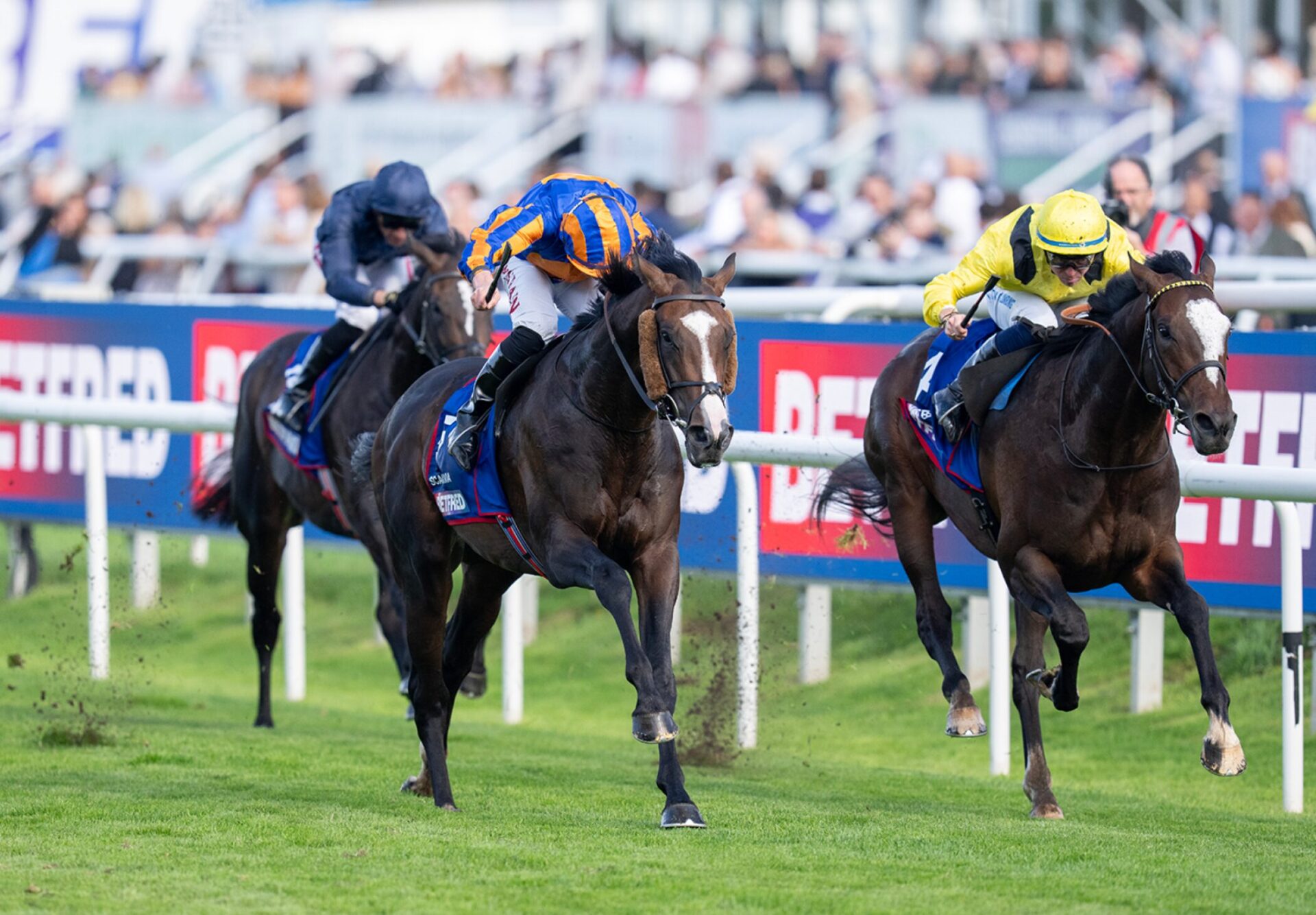 Wyścigi z udziałem koni O’Brien’a, zwłaszcza te ważne, zwykle rozgrywane są według podobnego scenariusza. Lider prowadzi mocnym tempem, którym zamęcza rywali na śmierć, a ten, dla którego bieg jest robiony, sięga po zwycięstwo. Przyznam się jednak, że pierwszy raz widziałem, żeby w roli rozprowadzającego wystąpił podwójny derbista! A na taki ruch zdecydował się właśnie nieobliczalny Aidan. Scandinavia rozpoczął zresztą tak mocno, że dłuższy moment musiał poczekać aż Lambourn wyjdzie na front. Aż do finiszu wszystko wyglądało bezproblemowo. Prosta w Doncaster ma prawie 1000 metrów, dosiadający faworyta Marquand zdecydował się więc na bardzo długi finisz. Kiedy wydawało się, że emocji w tym biegu nie będzie, rozpoczął się prawdziwy thriller. Idący od pola Carmers, którego dosiadał Billy Lee, przez moment położył się na Scandinavię, wybijając go z rytmu. Sytuacja jednak szybko wróciła do normy i równie szybko znowu się skomplikowała. Tym razem w roli atakującego wystąpił Stay True ze stajni… O’Brien’a, z dżokejem Mickaelem Barzaloną w siodle. Anglik i Francuz tak mocno zaangażowali się w bratobójczy pojedynek, że ich uwadze umknął fakt, iż przy kanacie rozpędza się Rahiebb. Jeszcze 500 metrów przed metą ogier trenera Rogera Variana był ostatni, ale potem rozpoczął fantastyczny finisz. Mam wrażenie, że Marquand bardzo późno go zauważył, bo jego uwagę zaabsorbował Stay True. Trzeba jednak przyznać, że Anglik szybko się pozbierał i po kapitalnej walce utrzymał przewagę szyi nad rywalem. To był dla niego wielki dzień. Kilka lat wcześniej wygrał wprawdzie ten bieg na Galileo Chrome, ale wtedy z powodu pandemii nie wpuszczono na tor publiczności. Finisz, triumf, a potem świętowanie sukcesu odbyło się w absolutnej ciszy. Na szczęście, tym razem było zupełnie inaczej. Prawie 30 tysięcy ludzi fetowało sukces rodaka.